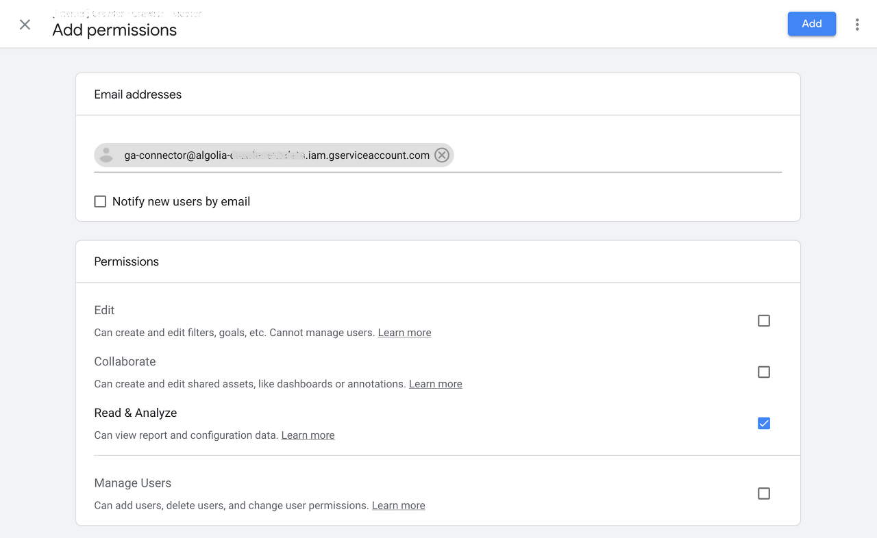 Now, an administrator of your Google Analytics account has to provide read access to your service account. To do this, follow these steps as an administrator: