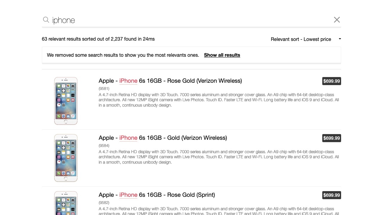 Returning to the preceding example: suppose a user searches “iPhone” and sorts results from lowest to highest price. The top results would be cheaper iPhone accessories like cases when the user was actually looking for the least expensive iPhones.
