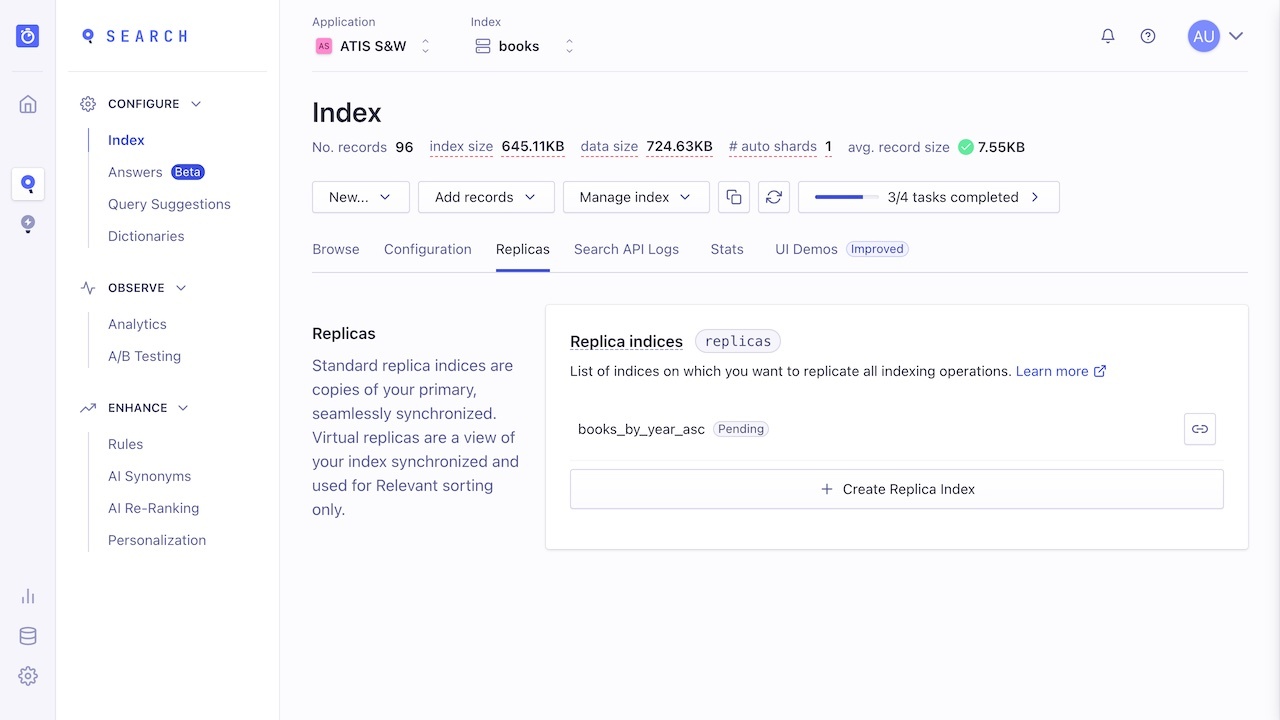 API를 통해 표준 또는 가상 복제본 색인을 삭제하려면 원본 색인의 setSettingsmethod를 사용하여 복제본 연결을 해제한 후 삭제를 사용해야 합니다.삭제할 복제본 색인의 색인 방법.