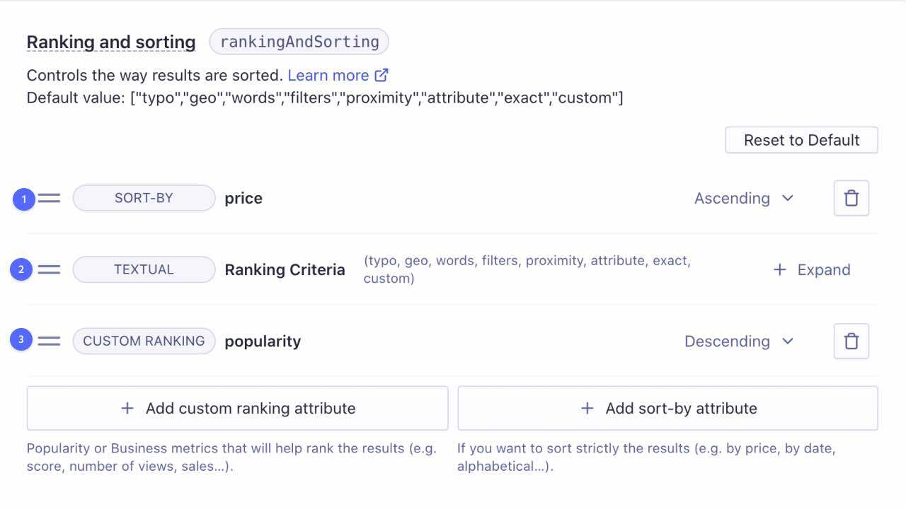 - Once sorted by the sort-by attribute’s value (price), products with the same price are ordered according to Algolia’s default textual ranking criteria.