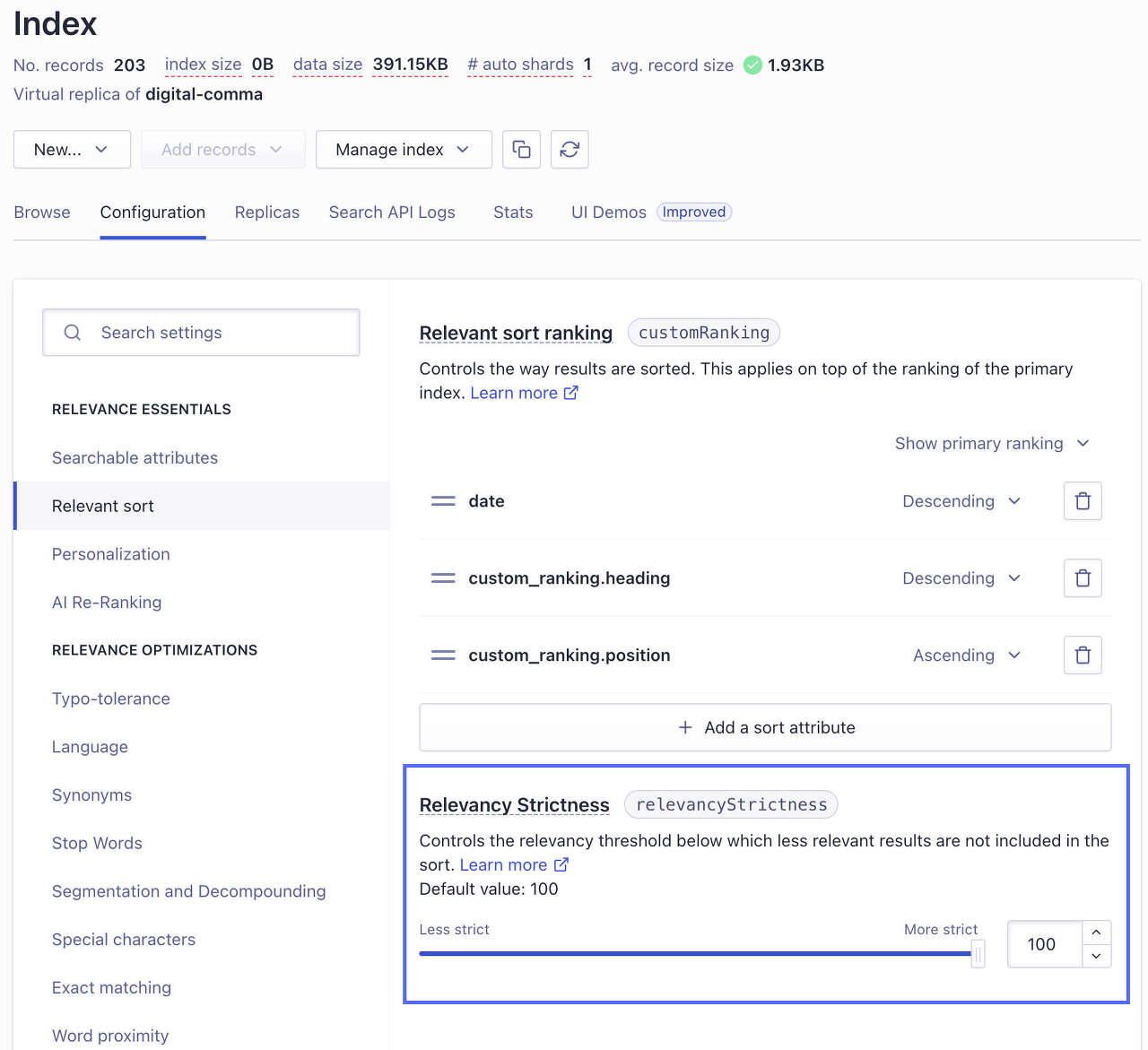 Using a virtual replica even with relevancyStrictness set to 0 can’t mimic the exhaustive sorting of a standard replica because it doesn’t use the same algorithm. Be aware that a virtual replica: