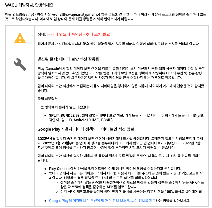 갑자기 이런 문제로 인해서 7월까지 고치지 않으면 앱 개시가 중단된다는 통보를 받았다..