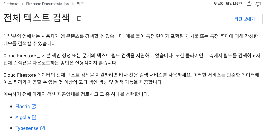 그러나 Firebase의 단점.. Nosql로 검색 기능이 강력하지 않다는 것이다.("Fulltext search를 지원하지 않는다" 라고 Firebase 공식 페이지에서 나와있음)
