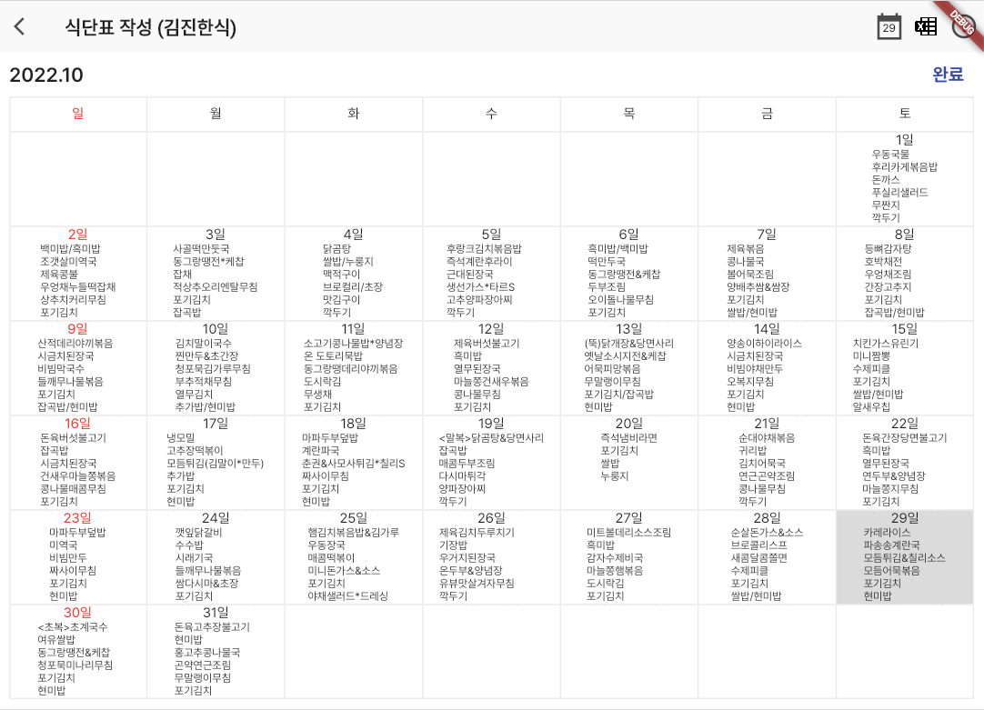 달력에 기능을 좀 추가했더니 식단표를 만들 수 있었다.