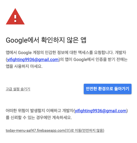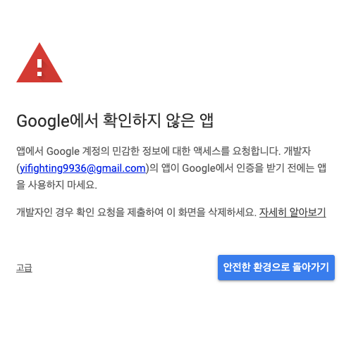 "이렇게 뜨는 데, 개발자인 경우 확인 요청을 제출할여 이 화면을 삭제하세요"라는 문구가 있다.