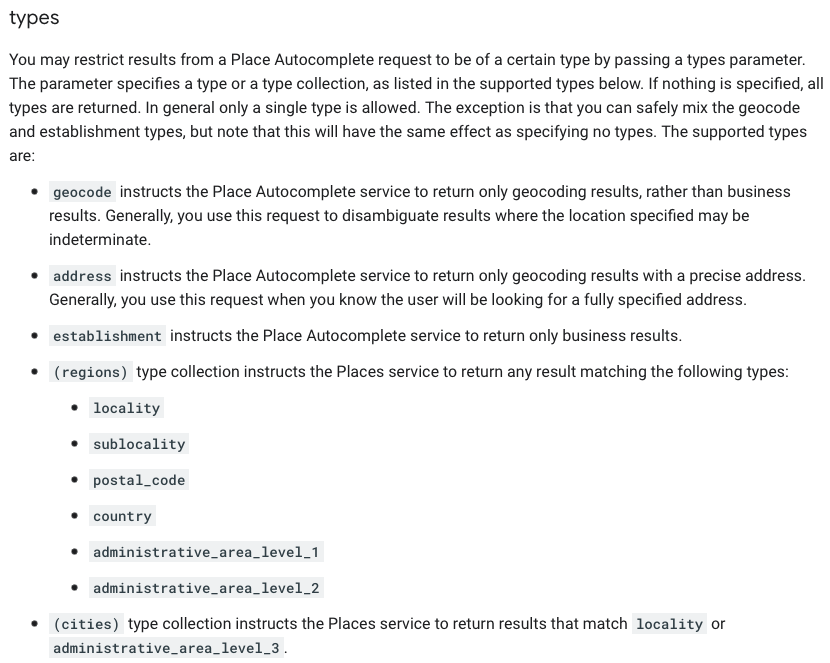 그 매개변수는(types) 아래의 supported types에 아래에 나열한 대로 type 또는 type collection을 지정합니다. 아무것도 지정하지 않으면 , 모든 유형이 반환됩니다. 보통의 경우 싱글 type이 허용 된다. 예외적으로 geocode와 establishment type을 섞을 수 있지만 유형을 지정하지 않는 것과 같은 효과가 있다. 제공되는 유형은 아래와 같다.