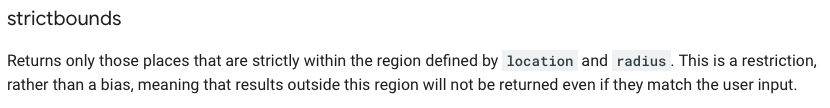지역과 반지름으로 엄격하게 정이된 지역내의 places들을 반환한다. 이는 편향이라기보다는 제한으로, 사용자 입력과 일치하더라도 이 영역 외부의 결과는 반환되지 않습니다.