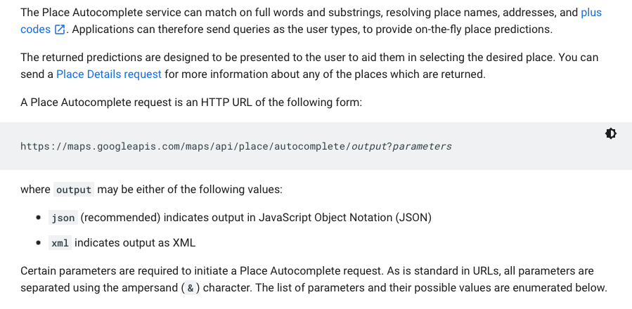 Place autocomplete는 전체 단어와 부분물자열을 매치하여 장소이름, 주소, plus code를 확인할 수 있다. Application들은 그래서 유저타입으로 쿼리를 보낼 수 있다(즉각적인 예측을 제공하기 위하여)