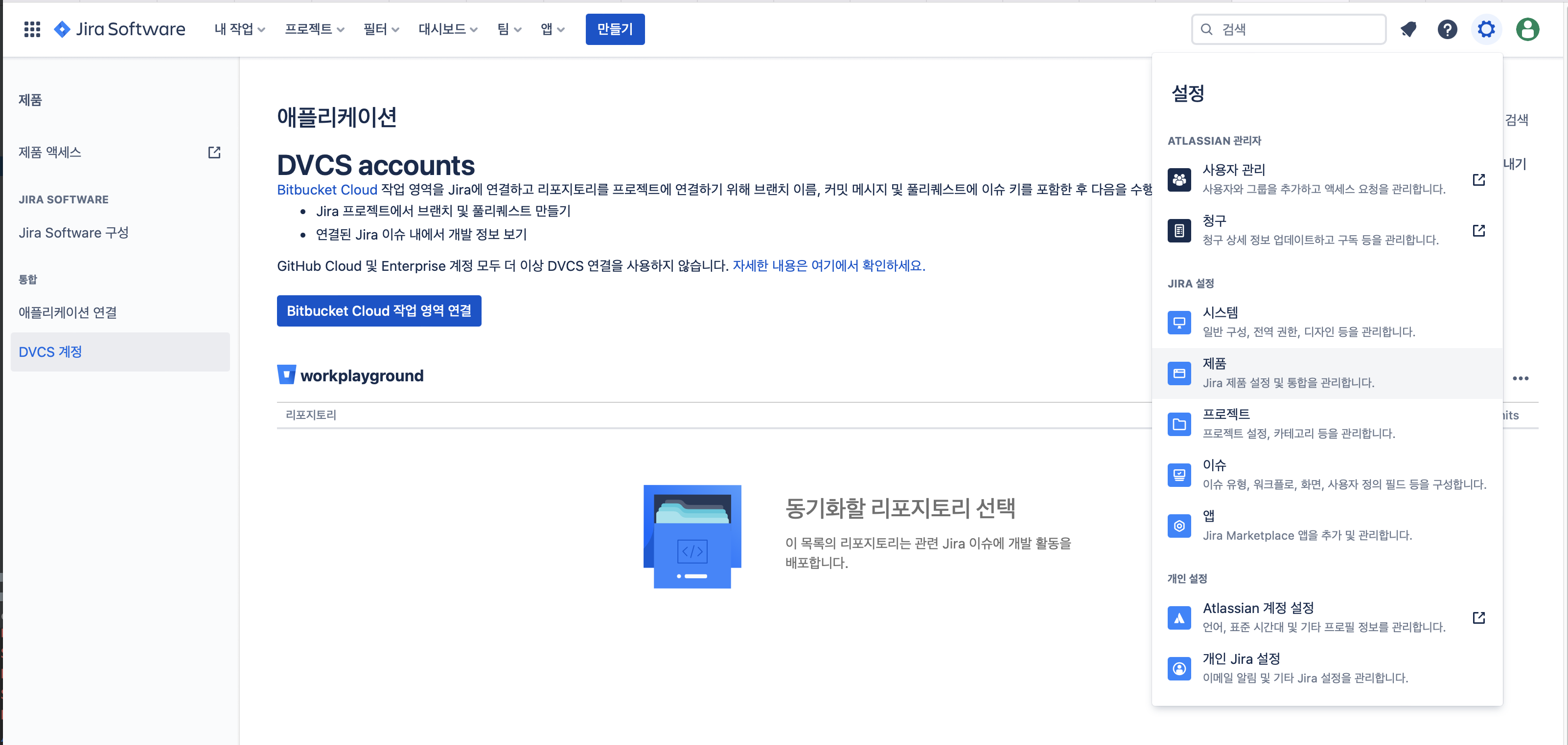 지라 프로젝트 - 설정 아이콘- 제품 - dvcs 계정- bitbucket cloud 작업 연결을 클릭하면 작업을 연결시킬 수 있다!