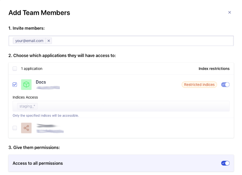 단일 환경의 모든 색인에 대한 액세스 권한을 가진 새 팀 구성원을 작성할 수 있습니다. Algolia 대시보드에서 Team 페이지로 이동합니다. 그런 다음, [팀 구성원 추가] 단추를 누르고 색인 상자에 접두사를 추가한 후 "*"(별표) 문자를 추가합니다. 예를 들어 스테이징 환경에 스테이징_*을 사용합니다.