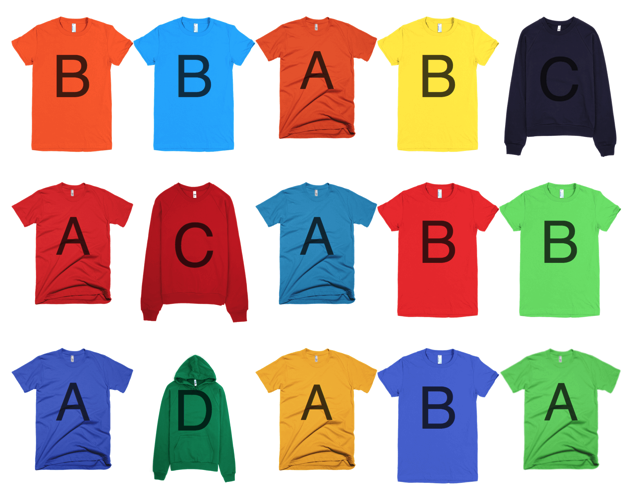 In the inventory, you have two t-shirt models (A and B) and two models of sweatshirts (C and D). Each model comes in several colors.