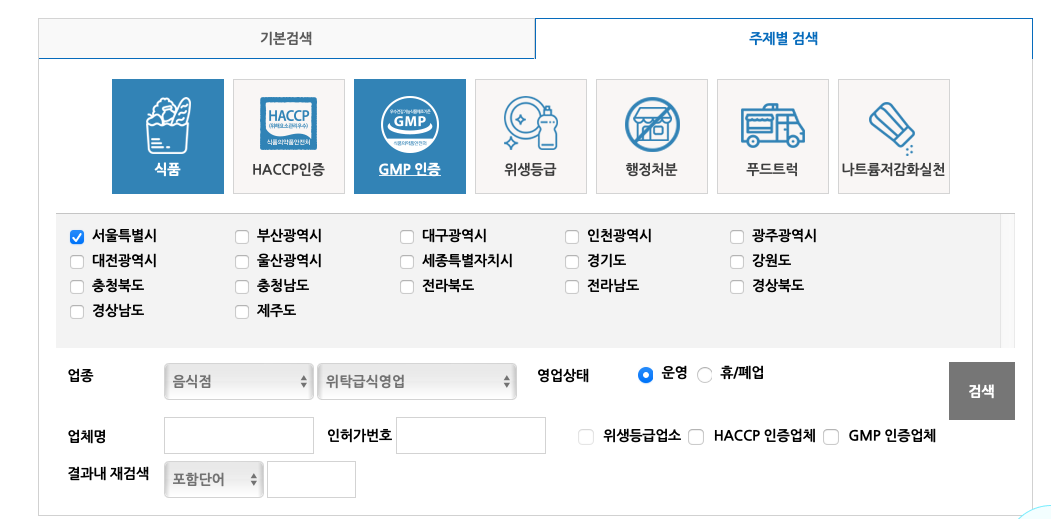 사업 급식소 위탁급식업체 급식 업체 검색 dev_caleb 2022. 10. 19. 16:15 728x90 http://www.foodsafetykorea.go.kr/portal/specialinfo/searchInfoCompany.do?menu_grp=MENU_NEW04&menu_no=2813 식품안전나라 안녕하세요. 식품안전나라 메뉴 안내봇에 오신 걸 환영합니다! www.foodsafetykorea.go.kr 홈페이지 들어가서 음식점 => 위탁급식영업 에서 검색 728x90