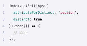 구별을 사용하려면 먼저 인덱싱 시간 동안 섹션을 attributeForDistinct로 설정해야 합니다. 그런 다음 distrent를 true로 설정하여 결과의 중복을 제거할 수 있습니다. 색인 작성 시 구분 설정은 선택사항입니다. 원하는 경우 쿼리 시간에 대신 설정할 수 있습니다.